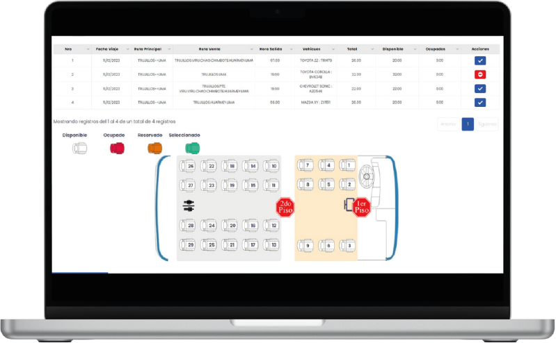 - Control de Buses: Seguimiento en tiempo real de disponibilidad de asientos y cupos por viaje.